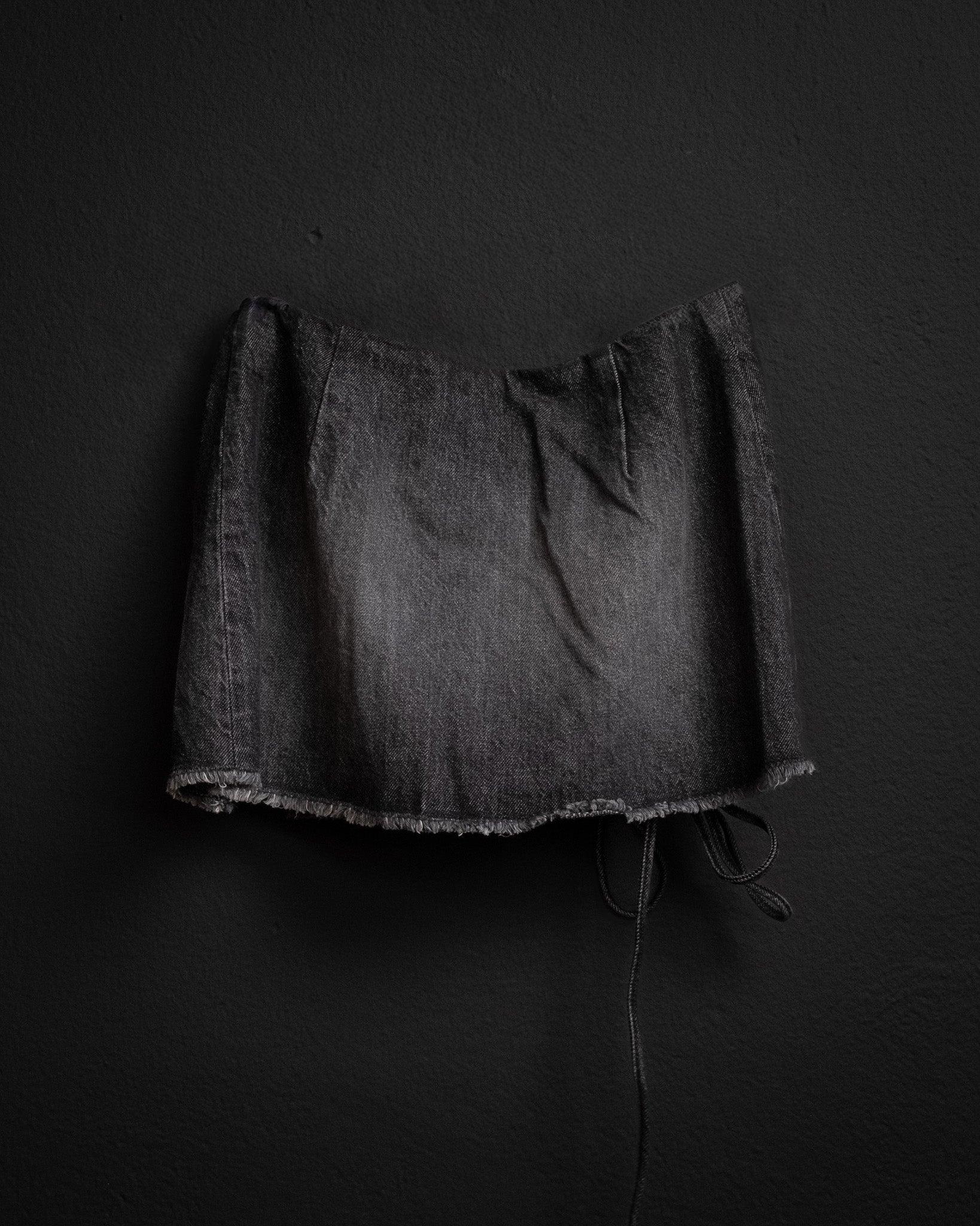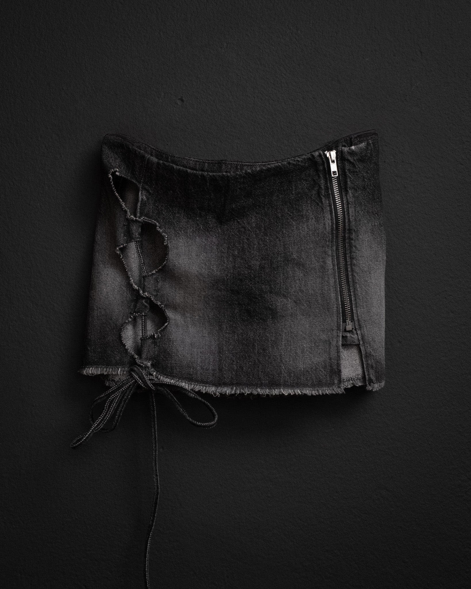 Black denim mini skirt with bold circular cutouts at the thigh and a tied hem detail. The washed finish and raw edges give it a worn-in, deconstructed look.