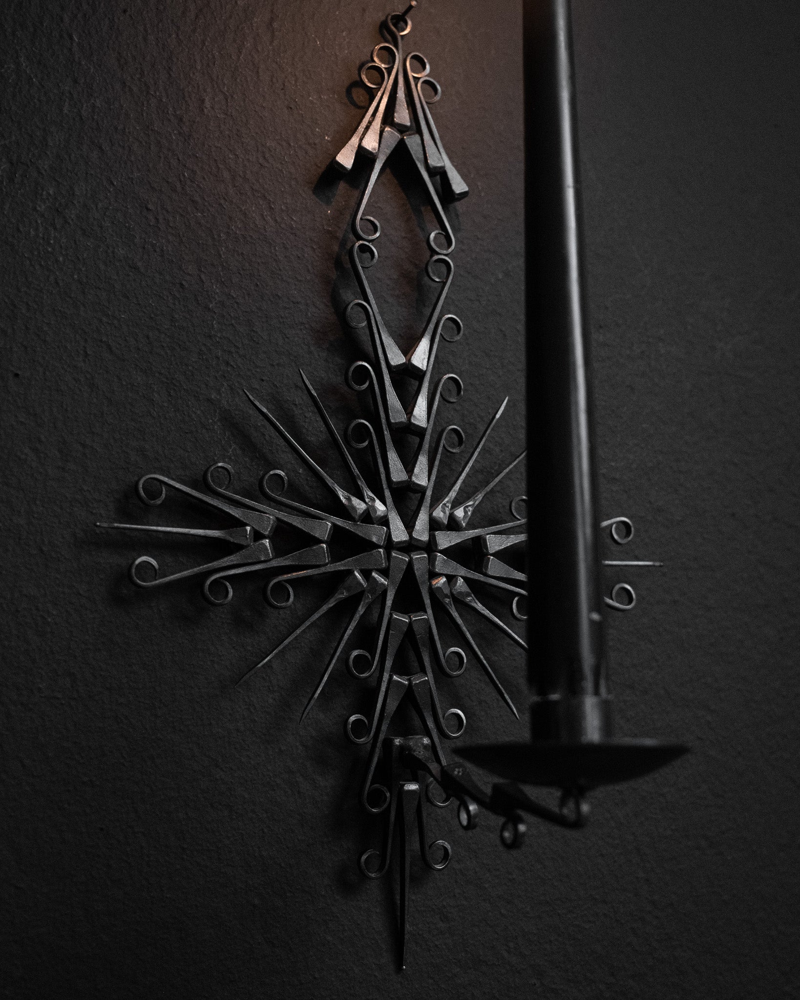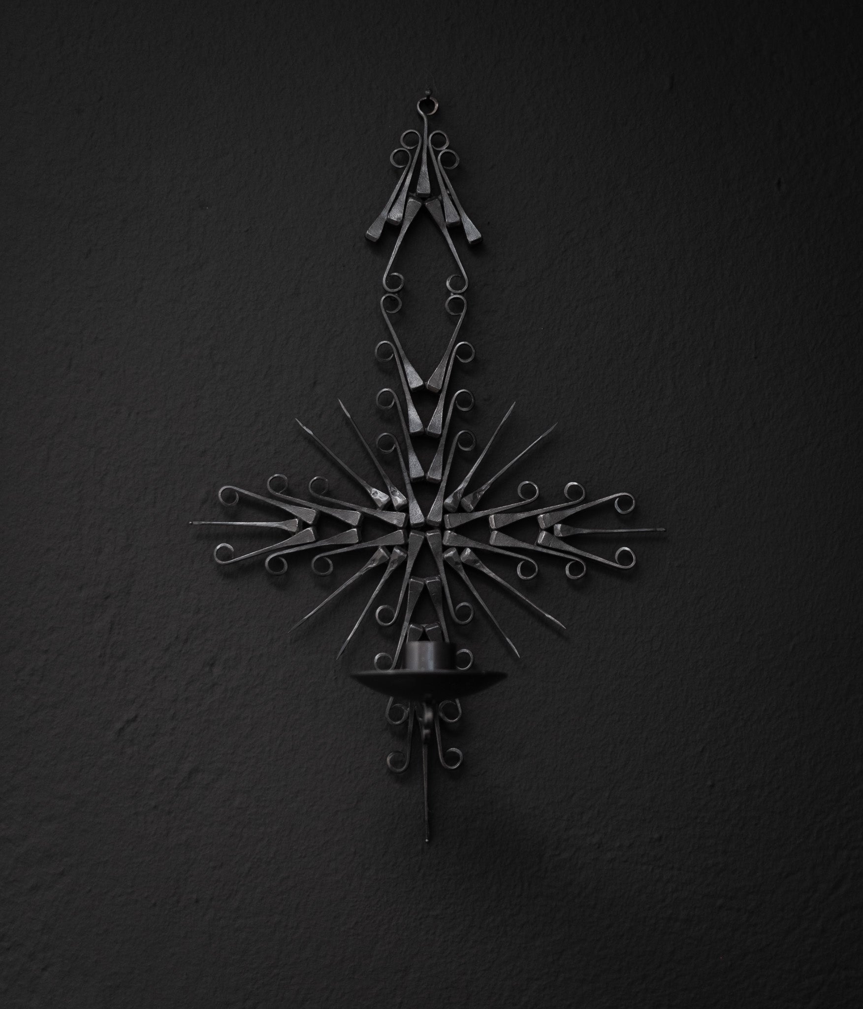 A sculptural wall-mounted candle holder crafted from forged horseshoe nails — a material rooted in traditional blacksmithing and folkloric symbolism, long associated with durability, protection, and luck. Each nail has been individually hand-bent and welded into a stark vertical composition, giving the piece a raw, architectural presence.