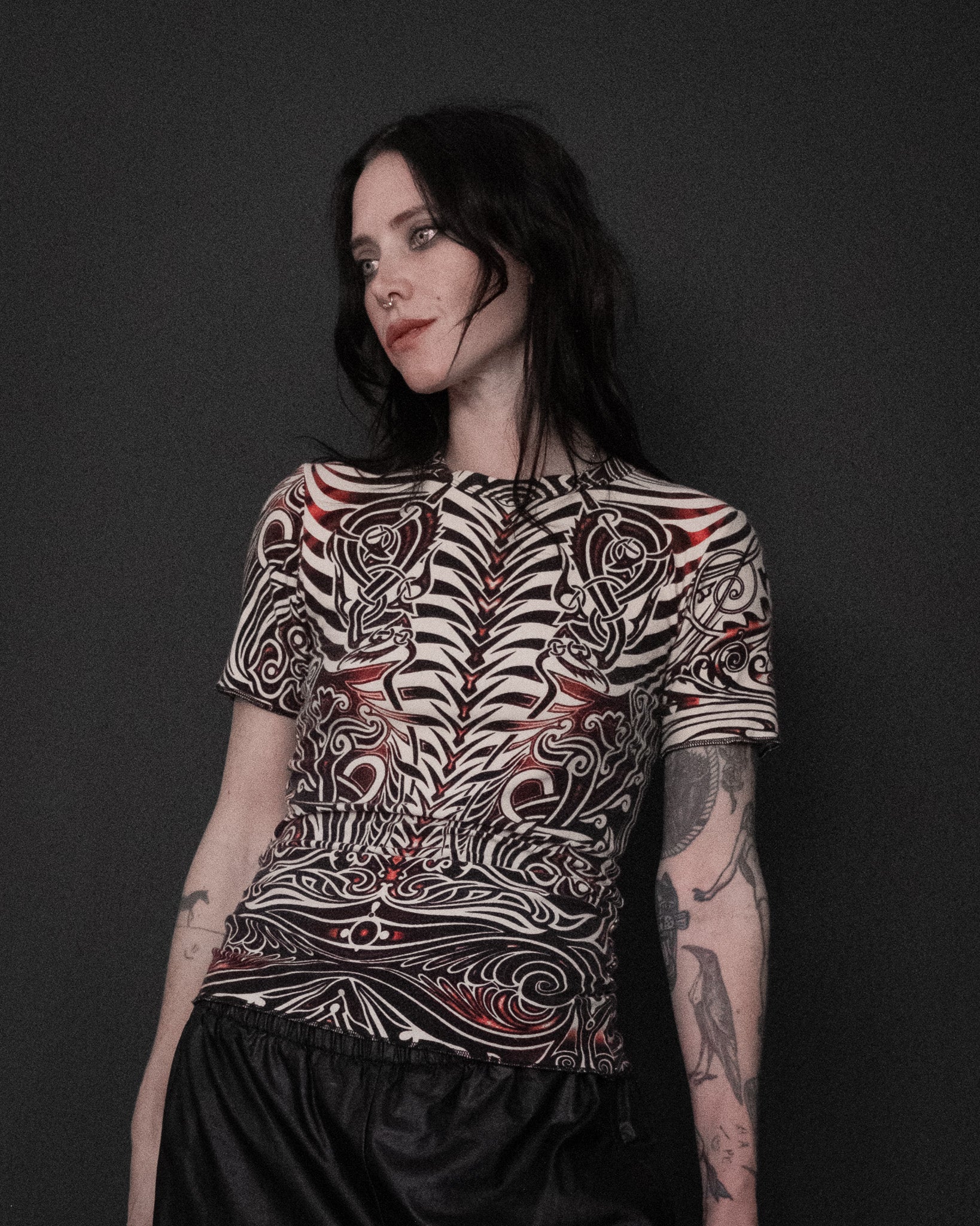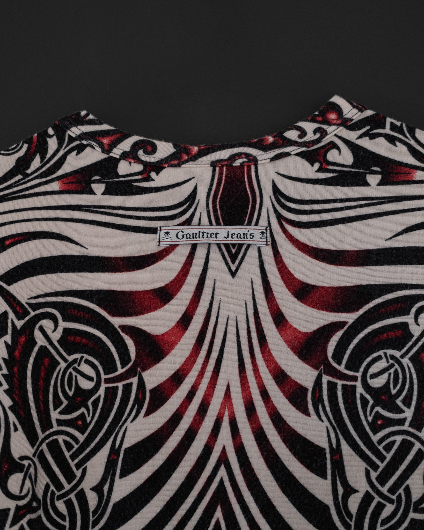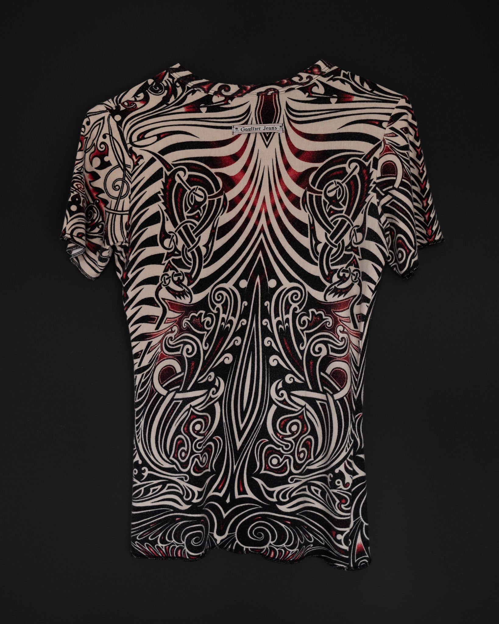 From the iconic Spring/Summer 1996 “Cyberbaba” collection — one of Jean Paul Gaultier’s most celebrated eras — this rare top captures the spirit of 90s techno-tribal futurism. Featuring a bold black and red tattoo-inspired print on soft off-white viscose blend, it’s a piece that perfectly merges rebellion, sensuality, and precision. Exposed overlock stitching and stretch construction give it a distinctly sculpted yet effortless silhouette.