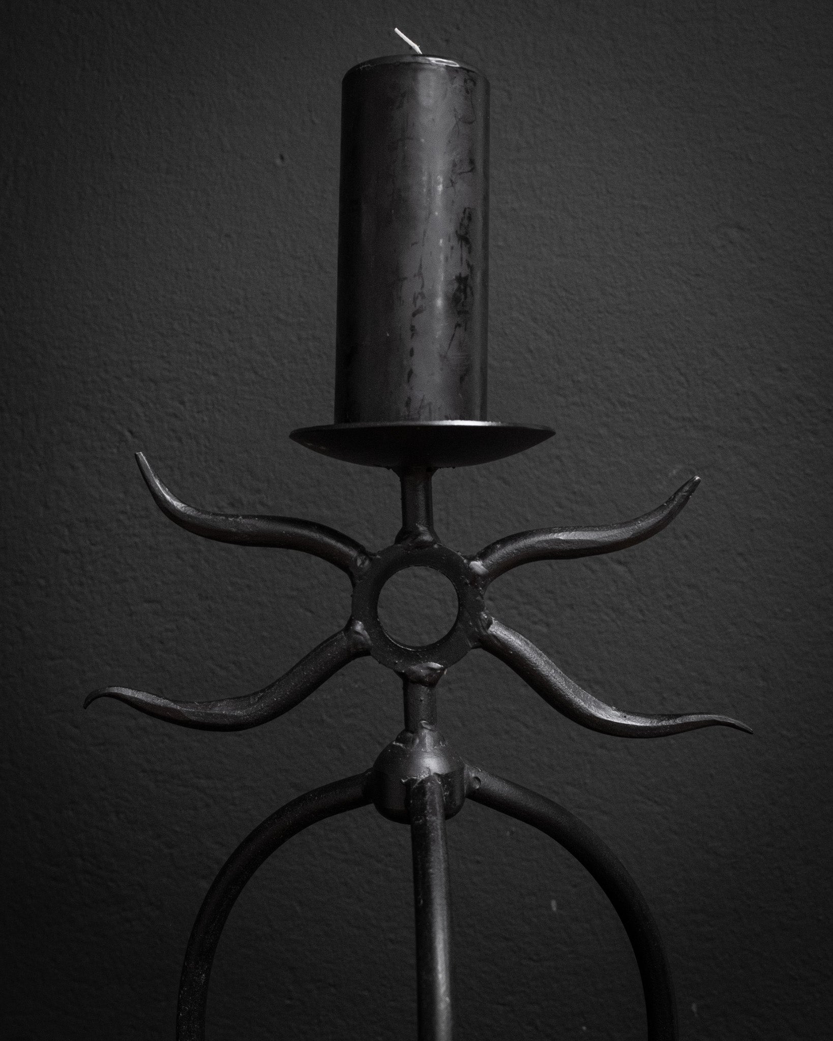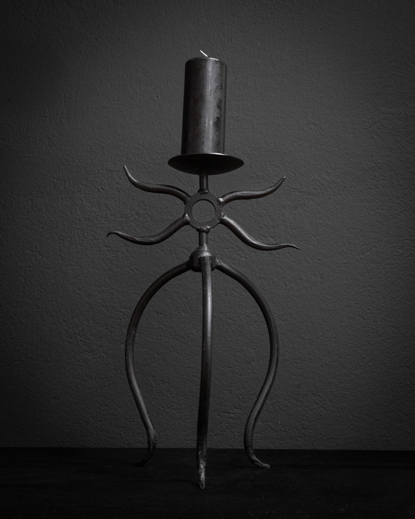 A heavy cast iron candle holder with a raw, dark finish and an organic, almost creature-like shape. Its branching arms rise upward like a silent figure caught in motion — giving the piece a mystical, sculptural presence. Built from solid cast iron, it brings weight, atmosphere and a quiet intensity to any space.