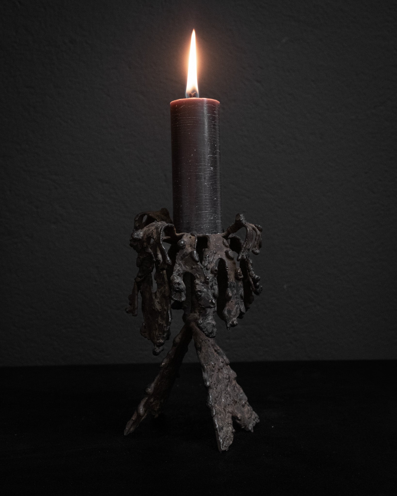 A hand-welded candle holder that embodies the raw poetry of brutalist design. Crafted in the 1960s–1970s, its organic, root-like form rises from the base with a sense of motion, while the dark patina and textured surface reveal traces of welding, oxidation, and time. A compact sculptural object — raw, expressive, and quietly powerful.