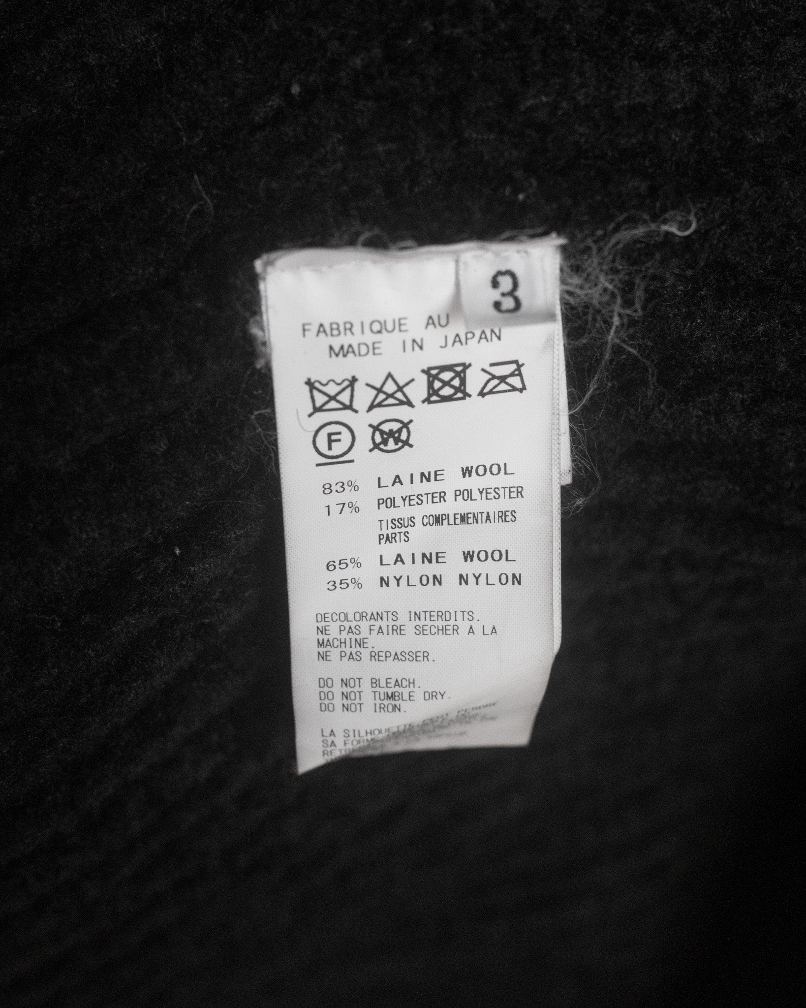 A heavy, long ribbed wool coat from Yohji Yamamoto’s Autumn/Winter 2018 collection. Built in deep black ribbed wool with Yamamoto’s signature balance of softness and structure, the piece functions fully as an outer coat: warm, weighty, and architecturally present.