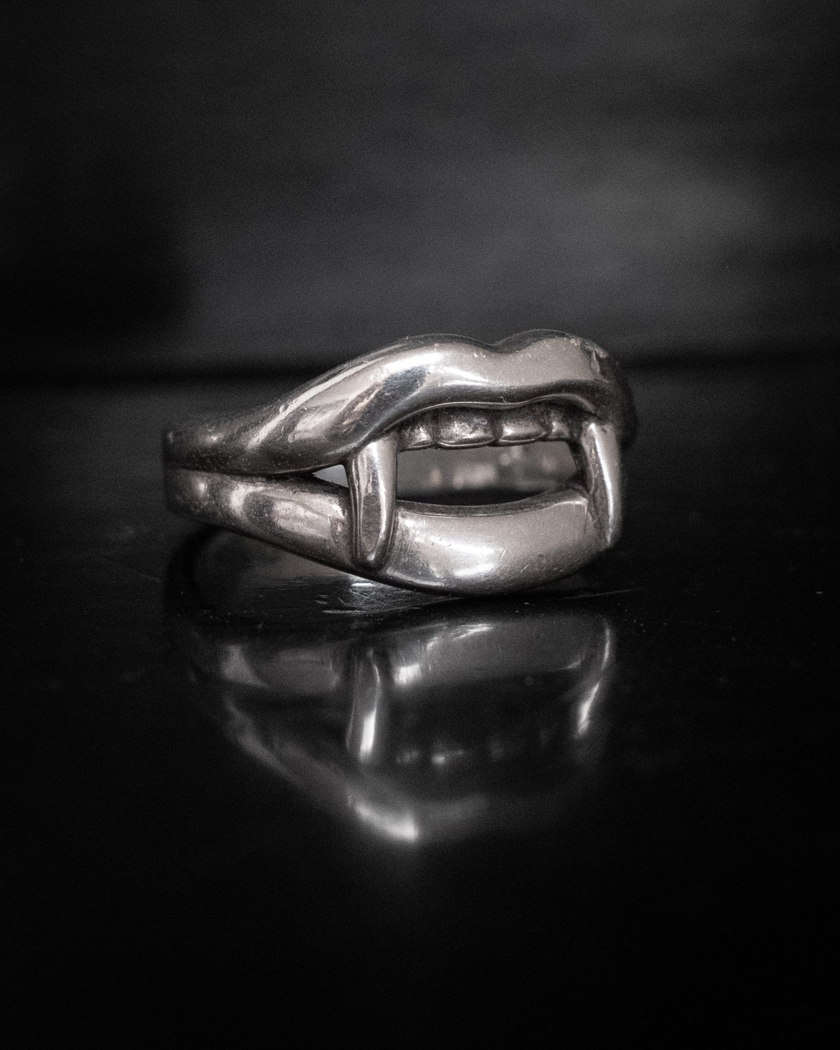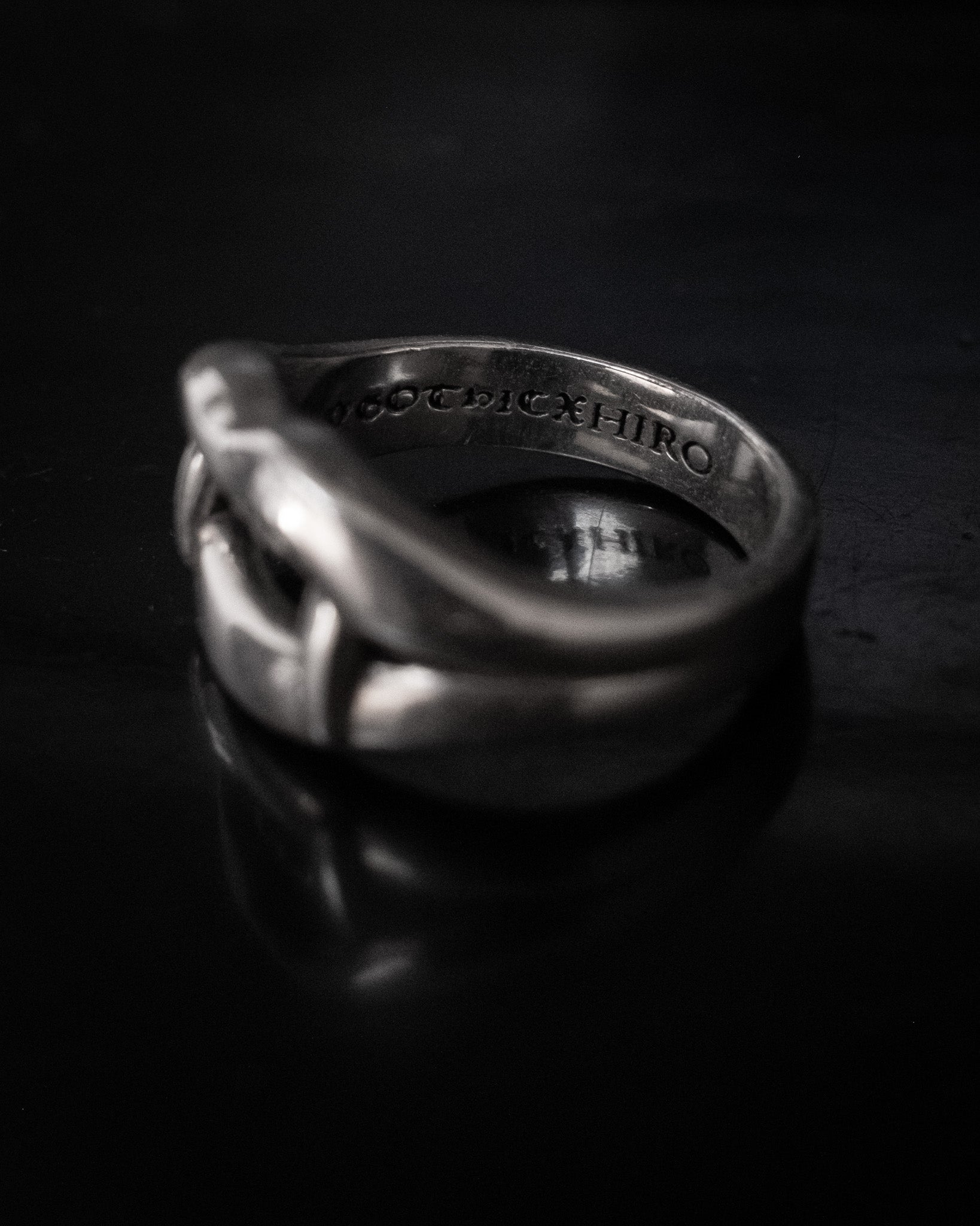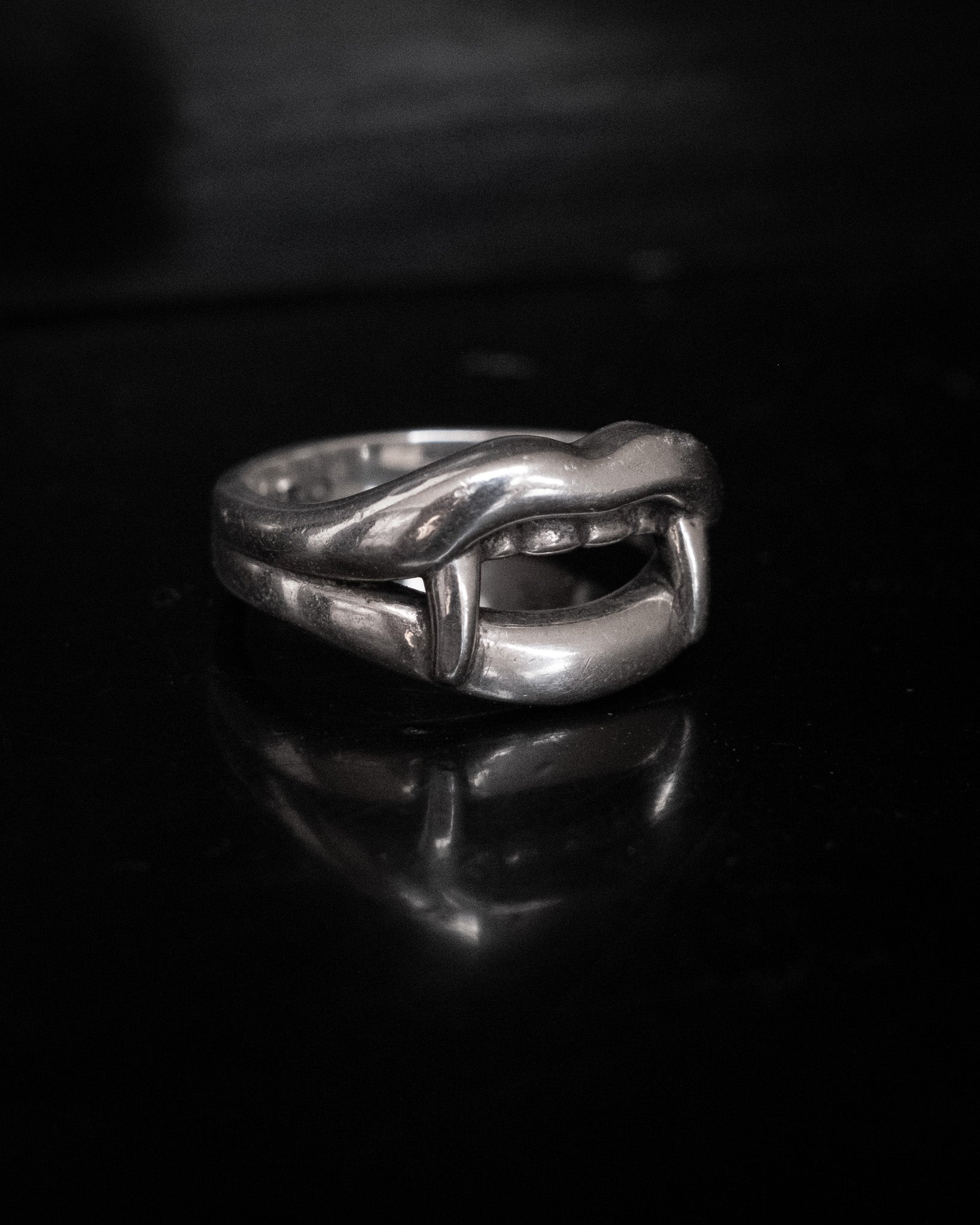 A sculptural 950 sterling silver ring from the GOTHIC YOHJI YAMAMOTO line, inspired by the grandeur of gothic architecture and sculpture. Featuring a fang-shaped cutout, the piece balances dark elegance with sharp minimalism.